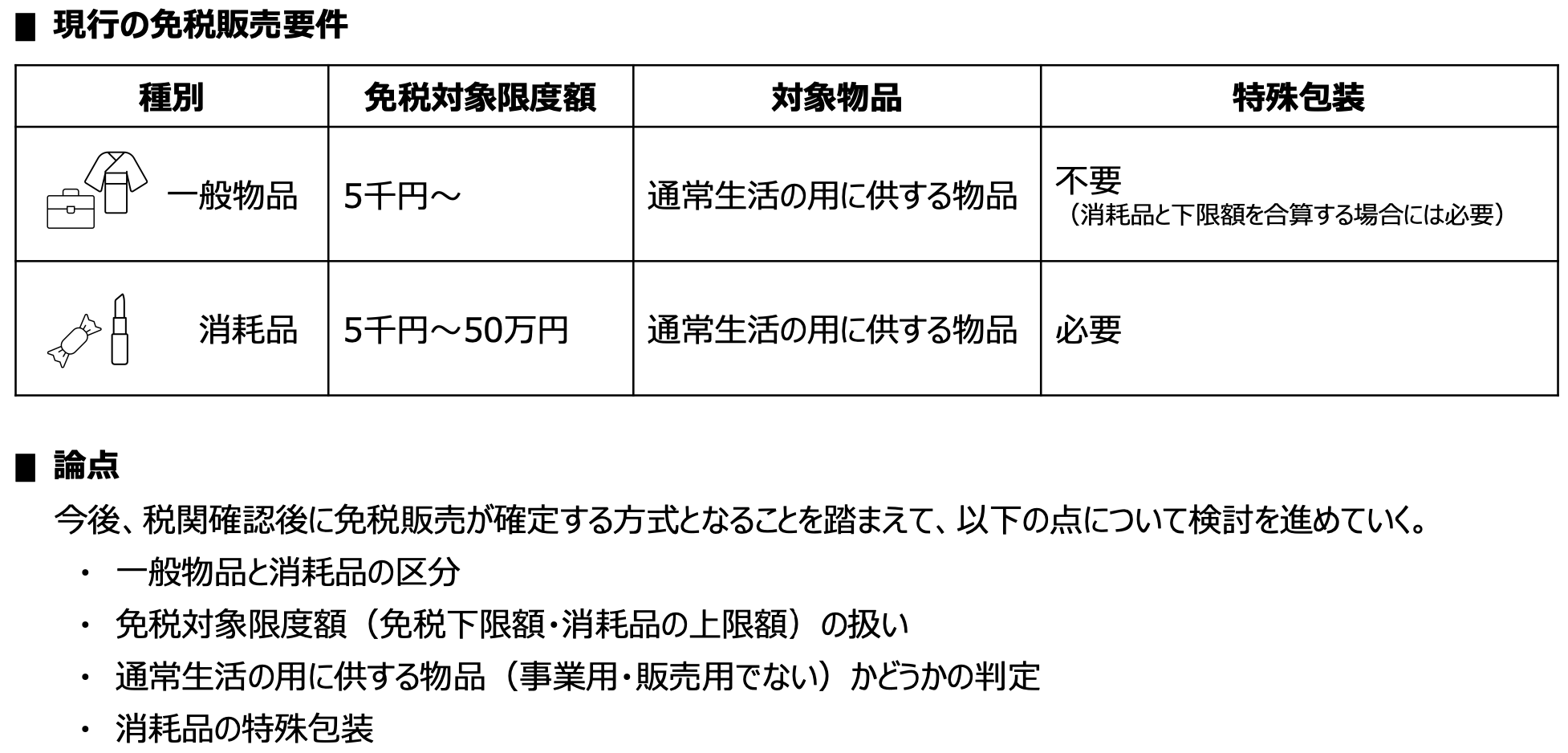 - 国内での消費や横流しを防止する観点から、免税対象物品を「一般物品」と「消耗品」に区分し、それぞれ異なる要件を設定している。