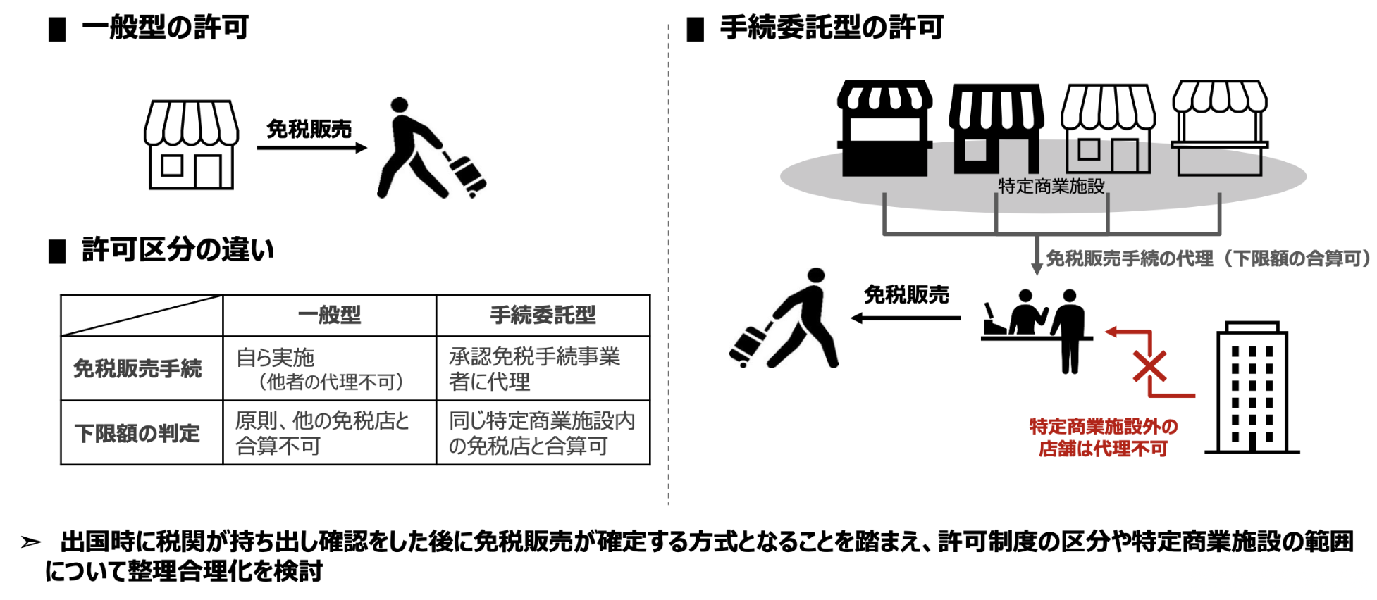 - 今後、出国時に税関が持ち出し確認をした後に免税販売が確定する方式となることを踏まえ、こうした許可制度の区分や特定商業施設の範囲について、整理・合理化を図る方向で検討を行う。