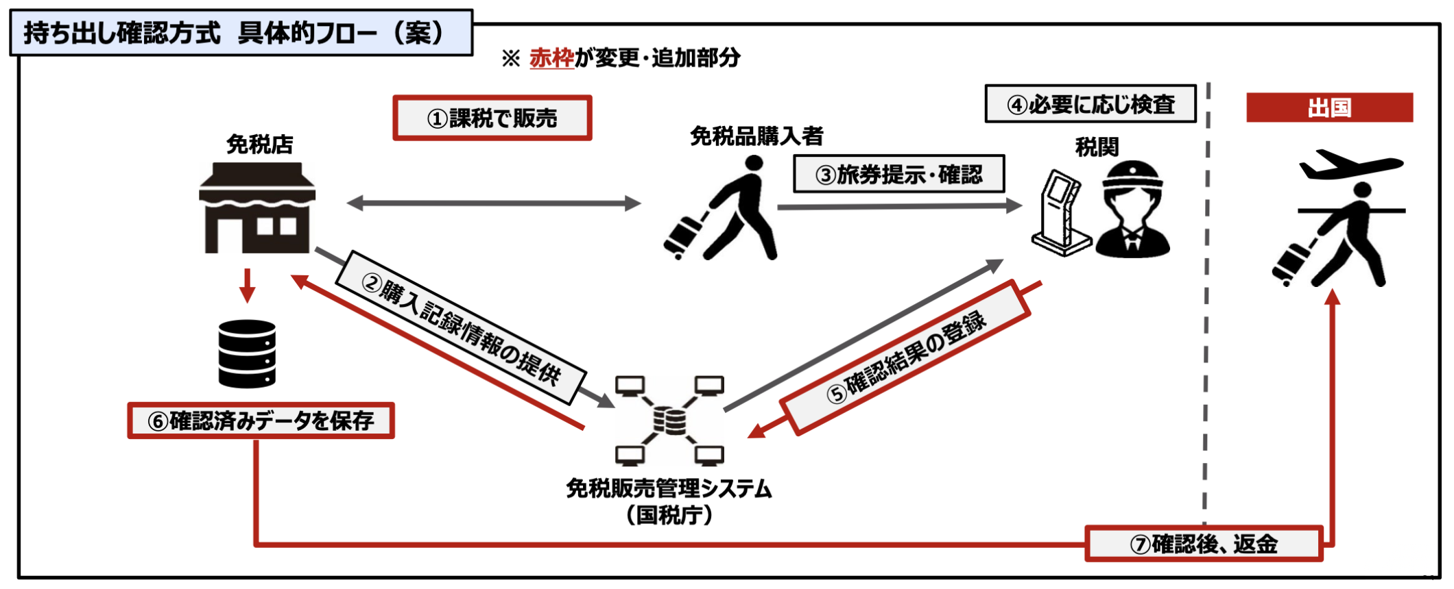 • こうした実態を踏まえ、早急に制度の抜本的な見直しを行う必要がある。具体的には、出国時に購入品の持ち出しが確認できた場合に免税販売が成立し、免税店が確認後に消費税相当額を返金する制度(下図)に見直す。