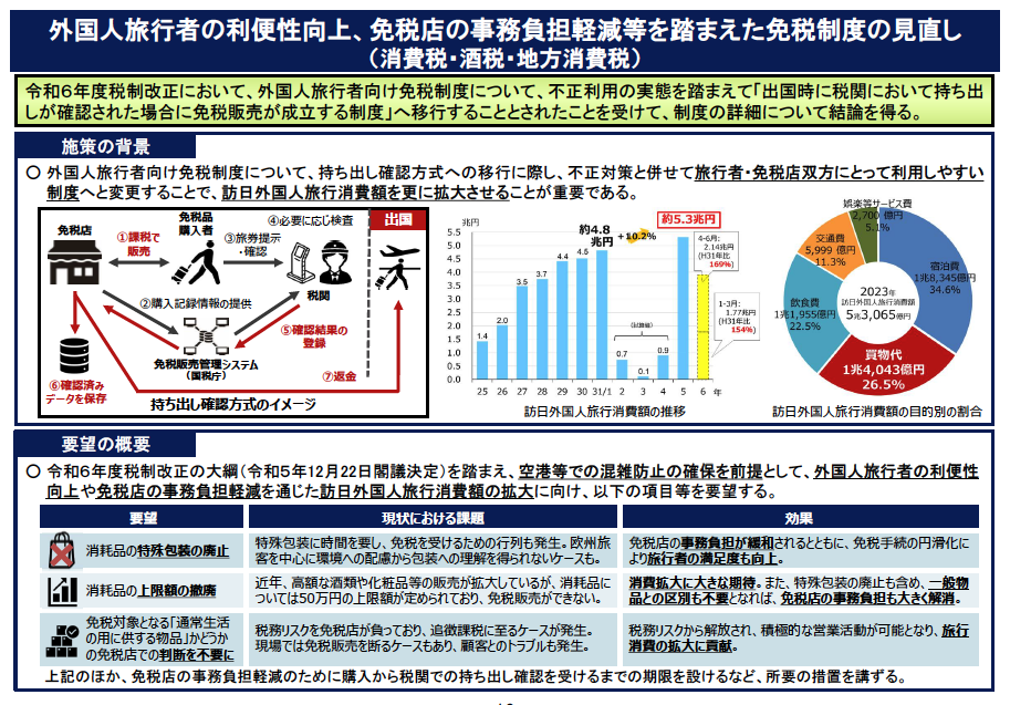 令和6年度税制改正の大綱(令和5年12月22日閣議決定)を踏まえ、空港等での混雑防止の確保を前提として、外国人旅行者の利便性向上や免税店の事務負担軽減を通じた訪日外国人旅行消費額の拡大に向け、以下の項目等を要望する。